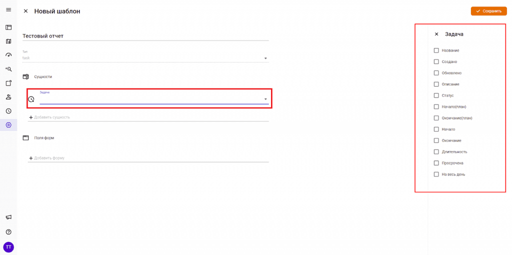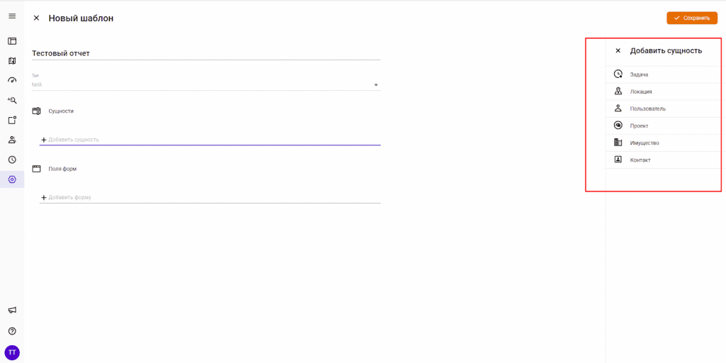 Выберите сущности, т. е то, о чем будет ваш отчет (задача, локация, пользователь, проект, имущество, контакт), кликнув «Добавить сущность». Доступные для выбора данные отобразятся справой стороны.