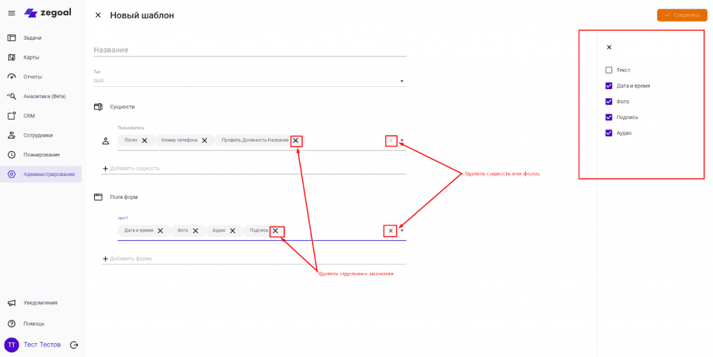 В примере, мы хотим видеть в отчете информацию из формы Тест1, а именно дату и время выполнения, фото, аудио запись и подпись сотрудника.