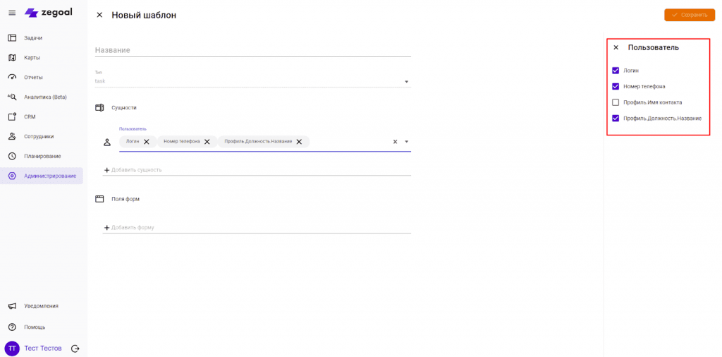 Например, нужно создать отчет, в котором будет содержаться информация о пользователе и его работе за определенный период. Выбираем сущность “Пользователь” и  данные, которые хотим видеть о пользователе: логин, номер телефона, должность.