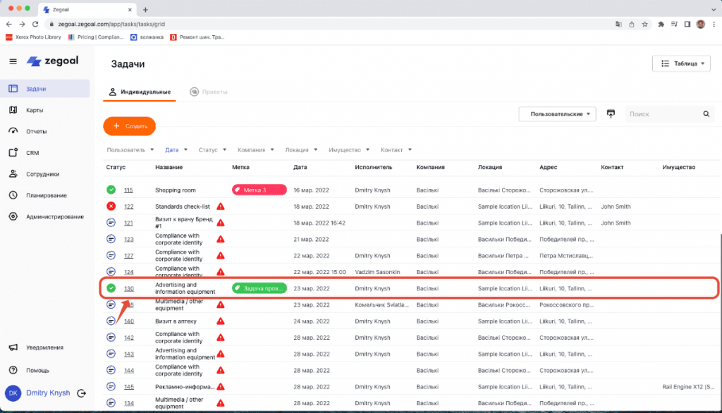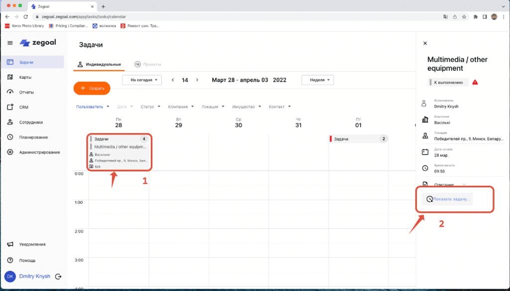 1. Из блока ЗАДАЧИ при клике на выбранную задачу в табличном или календарном виде. Табличный вид