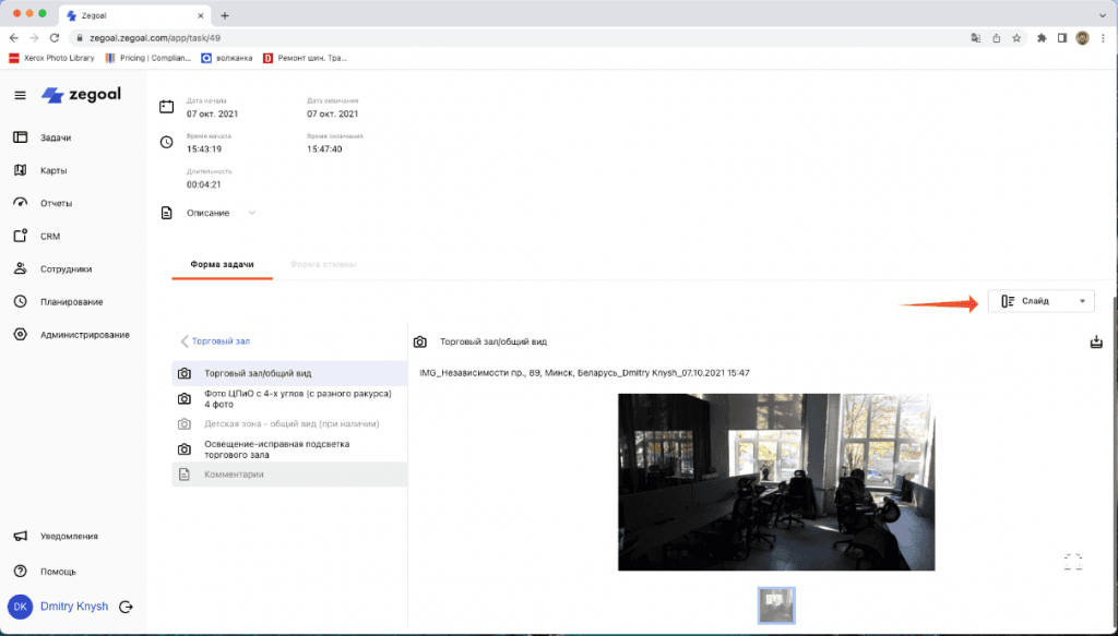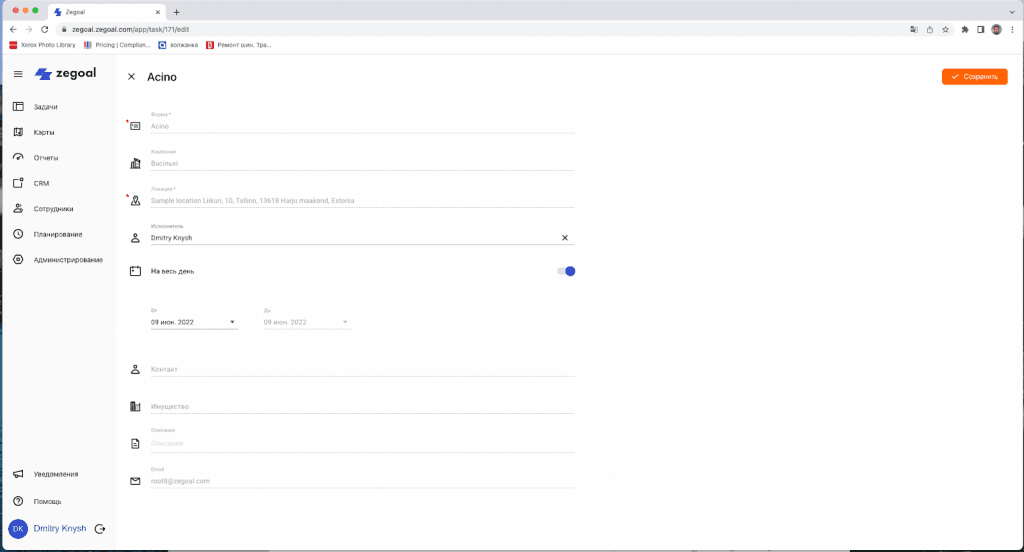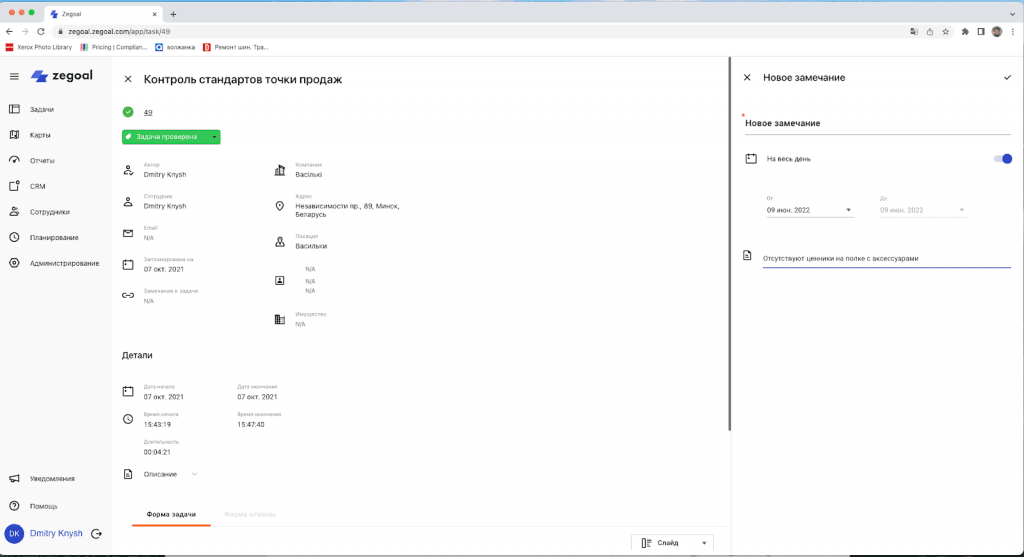 Внимание! Редактирование задачи допускается только при статусе “К выполнению”. Во всех остальных статусах редактирование запрещено. Список редактируемых полей задачи: Исполнитель, дата и время задачи