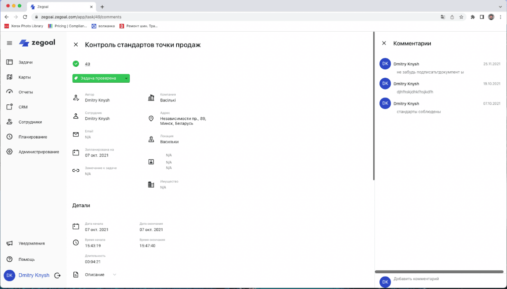 Кликните на кнопку вызова меню добавления комментариев (14). В боковой панели создайте комметарий к задаче. Для скрытия меню клините на кнопку х.