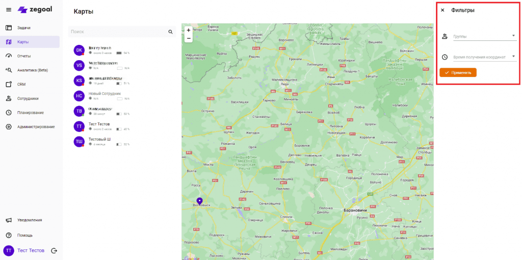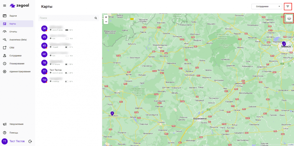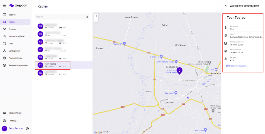 Во вкладке Карты отображается местоположение ваших сотрудников. Отслеживается заряд батареи, когда последний раз передавались данные о местоположении.