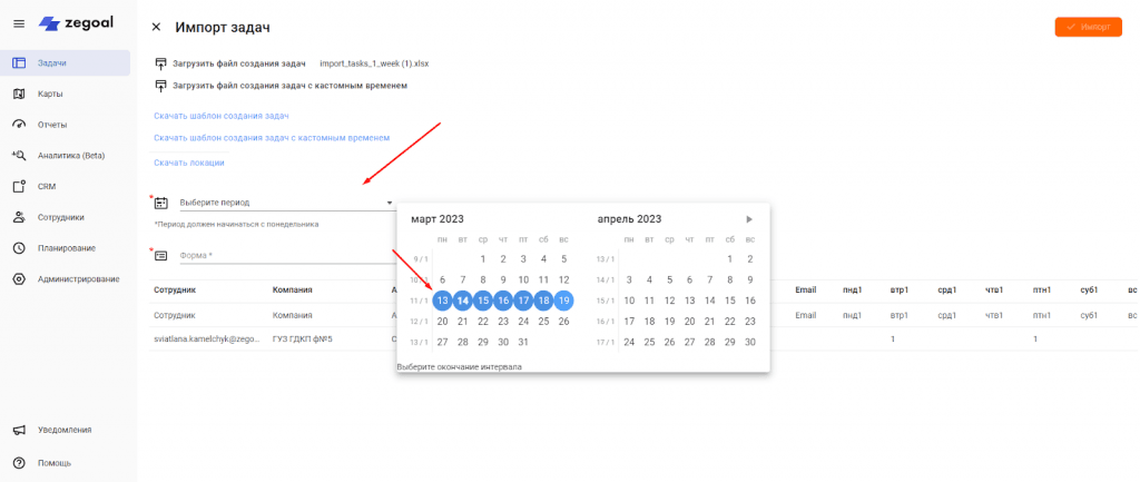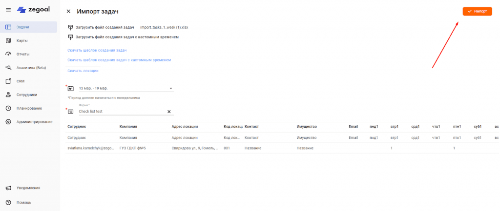 Кликните кнопку «Импорт», после этого перед вами откроется окно загрузки задач. Задачи можно ставить сроком исполнения на день либо на несколько дней. Используя файл для импорта можно поставить задачи на определенный день в течении недели, 2-х недель, 4-х недель