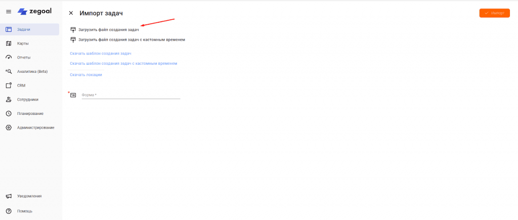 Для одновременной постановки сразу большого количества задач воспользуйтесь опцией «Импорт» в пункте Задачи.