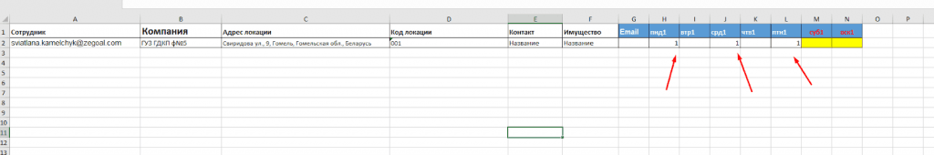 2. Наполните шаблон данными. Необходимо подготовить Excel файл с данными: внести информацию о сотрудниках, которым будет поставлена задача, компаниях, к которым относится локация, адресах локаций, на которые ставятся задачи, кодах локаций(ID), датах начала и окончания, а также времени начала и окончания задачи. Информация о контакте, имуществе, Email вносится, только если возникла такая необходимость. Также цифрой 1 необходимо отметить дни, на который необходимо поставить задачу.