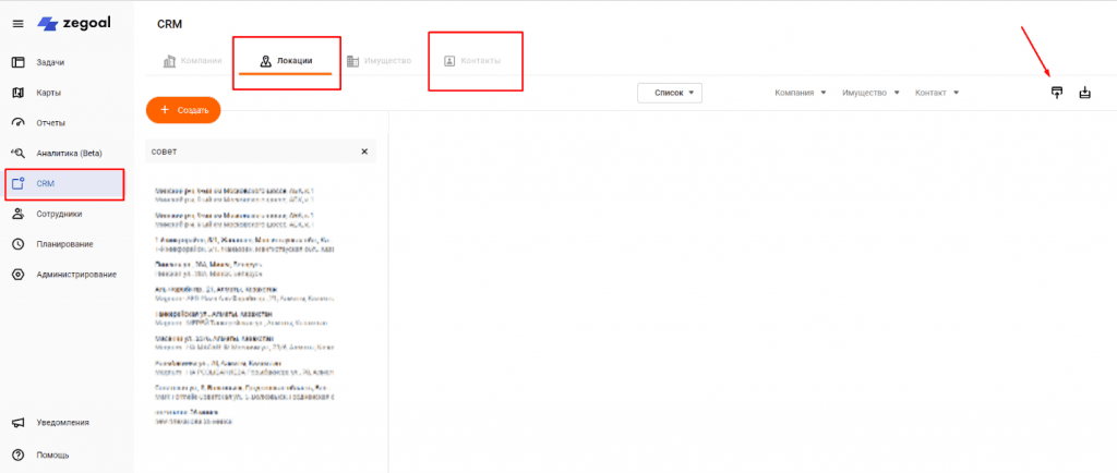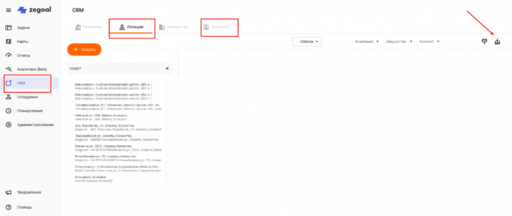 Постановка плана по количеству задач происходит с использованием шаблона Excel-файла «Редактирование локаций/контактов» на вкладке CRM. Скачать шаблон можно на соответствующей закладке в CRM. Кликните кнопку «Импорт», чтобы открыть окно с шаблонами. В открывшемся окне скачайте шаблон редактирования локаций/контактов соответственно.
