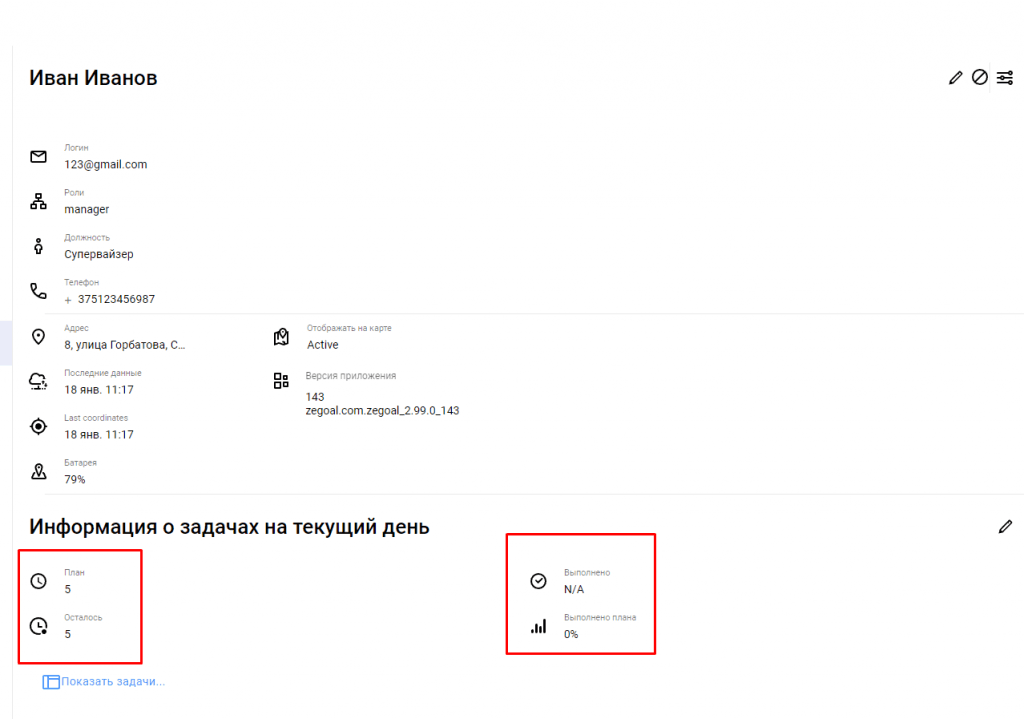 Блок «Информация о задачах на текущий день» находится внизу в карточке сотрудника.