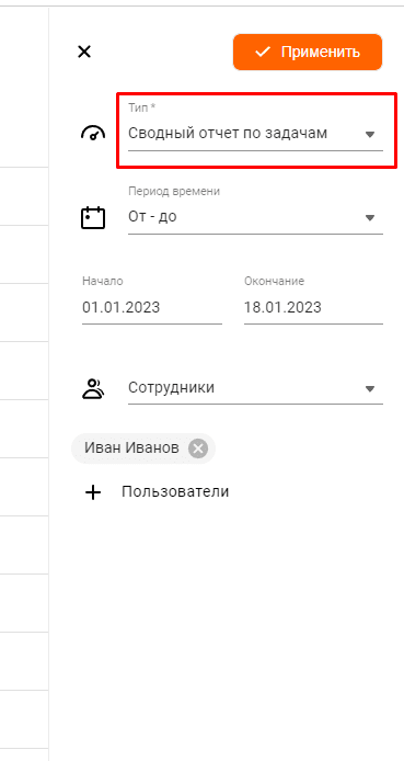 3. На вкладке «Отчеты» возможно сформировать «Сводный отчет по задачам», который покажет процент выполнения  плана за выбранный период. В дальнейшем будет доступна выгрузка данных в Excel.