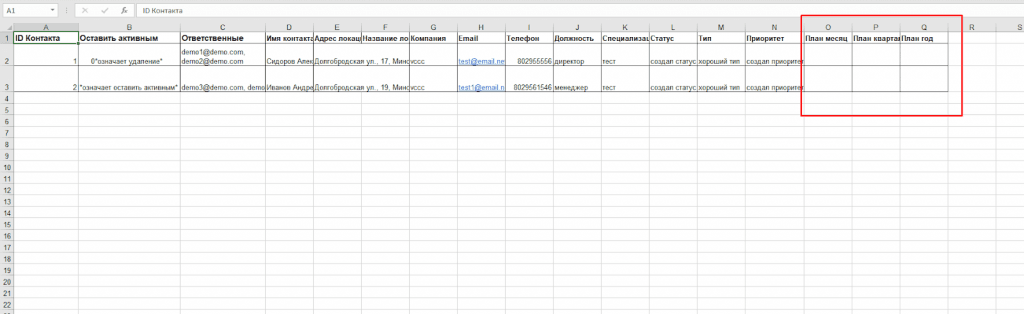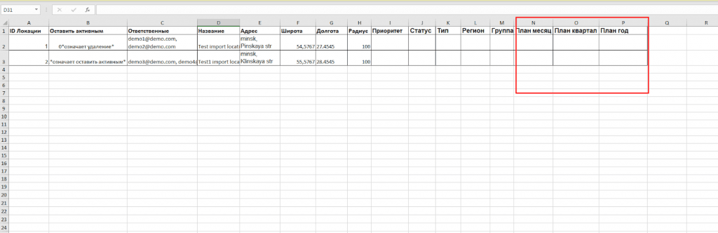 Помните! При заполнении шаблона важно указать не только плановое количество задач, но также заполнить и другие поля, данными, которыми обладает локация/контакт. Если оставить ячейки пустыми, при загрузке файла текущая информация о локации/контакте затрется. Перед заполнением шаблона рекомендуем выгрузить имеющуюся информацию о локациях/контактах из базы, используя кнопку экспорт.