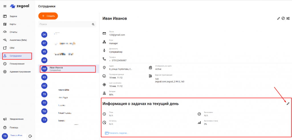 В веб-интерфейсе программы появилась возможность установить плановое количество задач для сотрудника на текущий день. Данная функция доступна пользователям с правами «Администратора».