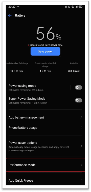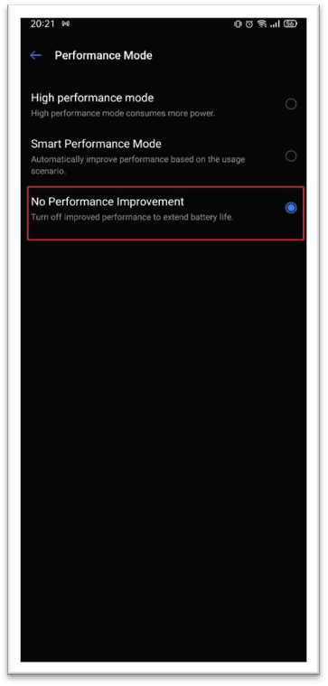 3. Настройки →Батарея →Режим производительности →Не улучшать производительность →Вкл
