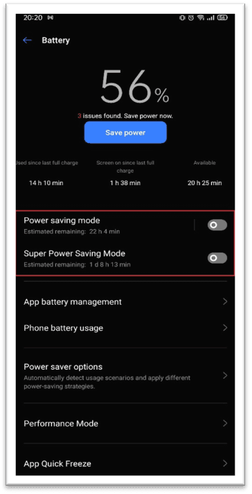 Настройки →Батарея →Режим супер энергосбережения →Выкл